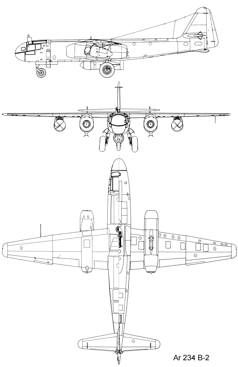 «Arado Ar.234 В-2» - одноместным, двухмоторным, реактивным самолетом. Был выполнен по схеме свободнонесущего высокоплана с трехопорным шасси, которое убиралось в полете. Фюзеляж машины был полностью выполнен из металла и имел конструкцию с 20 шпангоутами, которые соединялись работающей обшивкой и стрингерами. Обшивка была выполнена из дюралюминиевых листов, которые присоединялись к конструкции с помощью заклепок с потайными головками. Для улучшения аэродинамических качеств машины, стыки листов дополнительно шпаклевались. В передней части самолета находилась кабина летчика, имеющая достаточно большую площадь остекления.